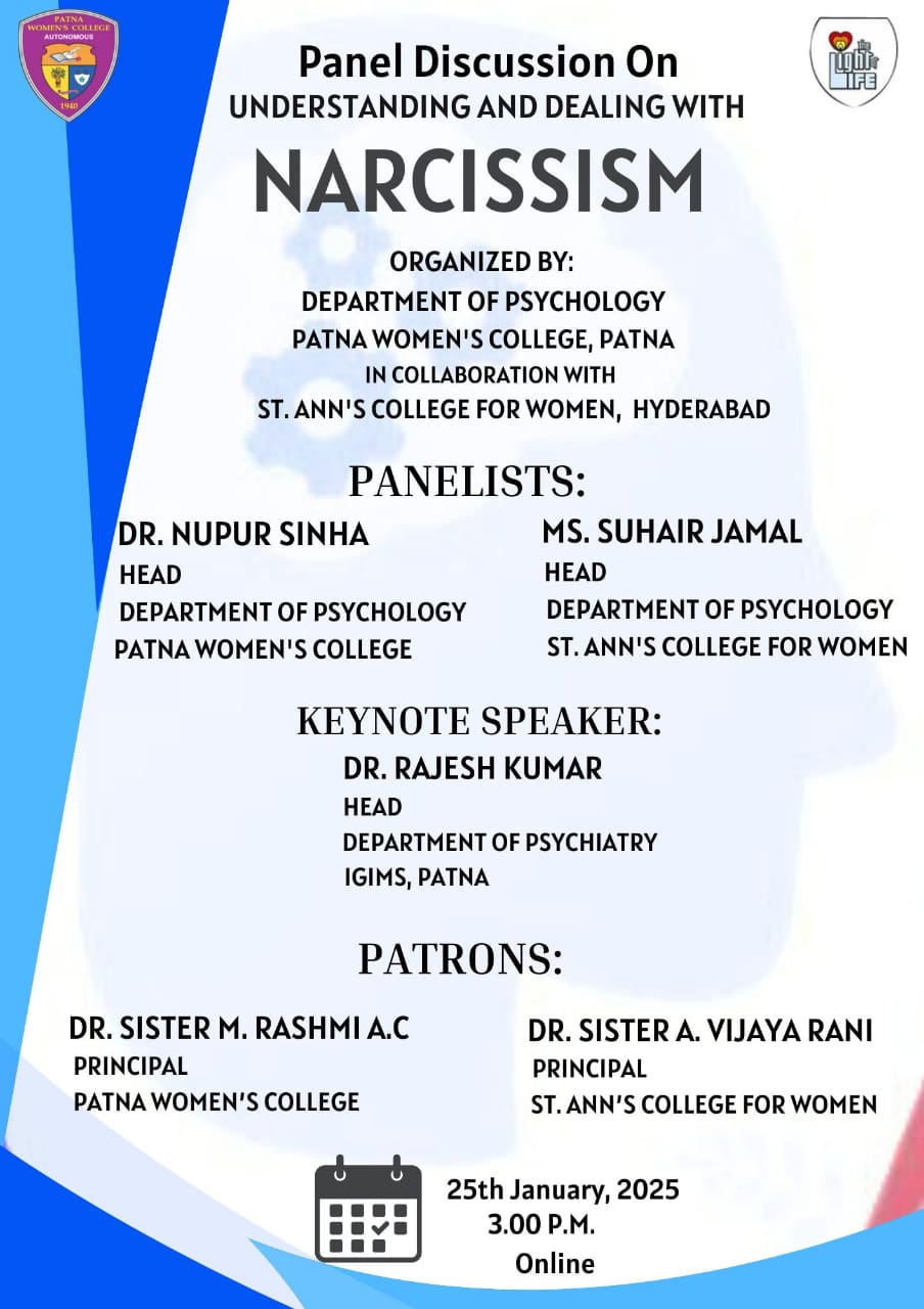 The Department of Psychology, Patna Women’s College, Autonomous, Patna University organised a Panel Discussion (online) on the topic ‘Understanding and Dealing with Narcissism’ in collaboration with Department of Psychology, St. Ann’s College for Women, Hyderabad on 25.01.25 at 3.00 pm. This was an activity with MoU College. Dr. Rajesh Kumar, Professor and Head, Department of Psychiatry, IGIMS, Patna was the Keynote Speaker. Sir discussed the concept in detail, conceptualization, and dealing with it. Ms. Suhair Jamal, Head, Department of Psychology, St. Ann’s College for Women, Hyderabad was the first speaker with the topic ‘Narcissistic Parents’. The high manipulative characteristics in parents, and dominance can disturb the healthy development of their child. On being adult, this person may be clueless as to what was wrong and would imbibe the same characteristics. Dr. Nupur Sinha, Assistant Professor and Head, Department of Psychology, Patna Women’s College was the second speaker with the topic ‘Narcissism and Digital Media’.