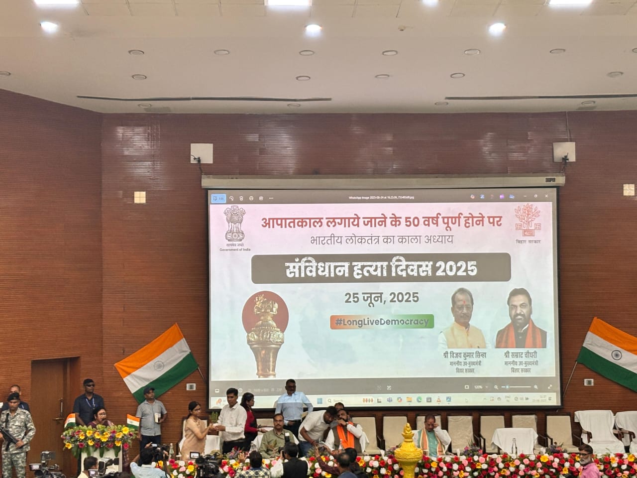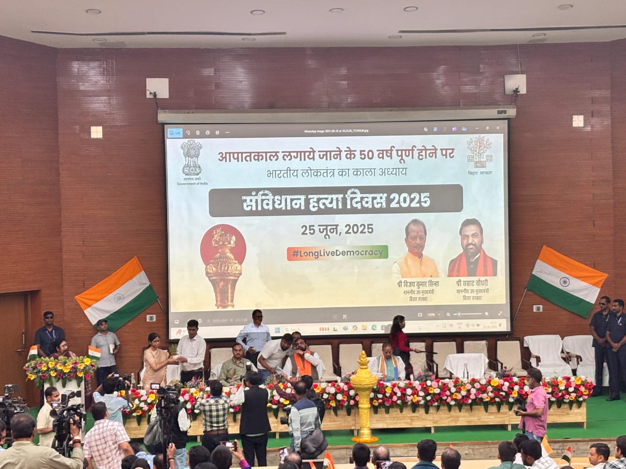 On 25th June 2025, at 11:00am ,a solemn and thought-provoking state-level programme was organized at Adhiveshan Bhawan, Patna, on the occasion of the observance of Samvidhan Hatya Diwas. The event was conducted under the aegis of the Department of Art, Culture and Youth (Directorate of Cultural Affairs), Government of Bihar, to reflect upon and raise awareness regarding constitutional values and democratic responsibility.