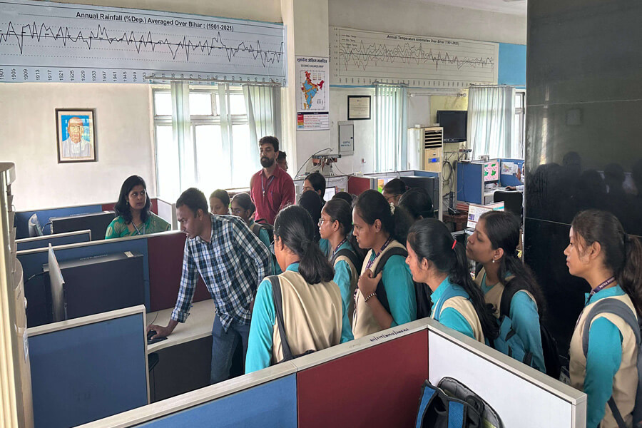 Another fascinating device was the Campbell-Stokes Sunshine Recorder. The students also learned about radiation-measuring instruments that help monitor solar and terrestrial radiation—an essential component in understanding climate behavior and energy balance.They were shown various sophisticated equipment and advanced technology used for weather analysis and forecasting. Among them were radar systems, automatic weather stations, and other high-end instruments that aid in accurate data collection. The control room had multiple computer systems monitoring real-time weather data across different regions of Bihar. It was fascinating to witness how science and technology converge to track atmospheric conditions and make reliable weather forecasts.