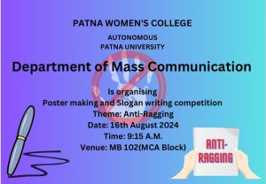 The Department of Mass Communication organized an Anti-Ragging Day on 12th of August to raise awareness among the students regarding the peril. To mark this day the department screened several documentary films related to the subject. The aim was to prohibit, prevent and eliminate the scourge of ragging. The Documentary featured multiple aspects related to ragging like the sections and helpline numbers.