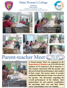 A Parent-teacher Meet was organized in the Department of Chemistry on 19.10.2024 for the students of UG Semester-I, III & Semester V. The teachers interacted with the parents and discussed about the performances and conduct of their wards. The answer sheets of recently conducted Mid Semester Exams were shown to the parents. The discussions regarding the overall performances of the students, their preparedness for end semester examination, the upcoming study tour and their future career opportunities were very fruitful.
