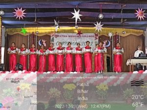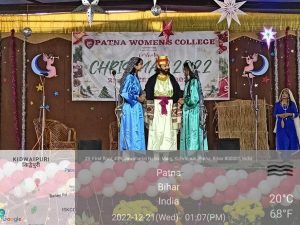 Patna Women’s College (Autonomous) fervently celebrated Christmas on 21st December, 2022 in the Open-Air Stage Hall. The programme was organized in two shifts for 1st and 2nd year followed by the 3rd year students. The programme commenced with a devotional opening dance. A euphonious English Carol song was presented next by a group of students. A skit throwing light on the birth and upbringing of Jesus along with the difficulties faced was portrayed. The students presented a scintillating Tribal Dance. A melodious Hindi Carol “Purab me chamka ek tara was performed. Dr. Sister M. Rashmi A.C., Principal, Patna Women’s College addressed the students and emphasized on the significance of Christmas. The entire event was moderated by Vartika and Ipsita. Vote of Thanks was proposed by Aaisha Raza, Cultural Secretary, Student Council 2022-23, Patna Women’s College. The entire programme was conducted under the guidance of Dr. Sister M. Rashmi A.C., Principal and Dr. Sister M. Tanisha A.C., Vice-Principal and Head, Department of Home-Science, Vice-Principal, Patna Women’s College. The entire event was coordinated by the Cultural Coordinators Ms Enakshi Dey Biswas, Coordinator, Performing Arts, Ms. Samiksha Sinha, Assistant Professor, Department of Sociology and Dr. Tauseef, Head, Department of Communicative English, and and the entire department of Communicative English, and Media Studies.