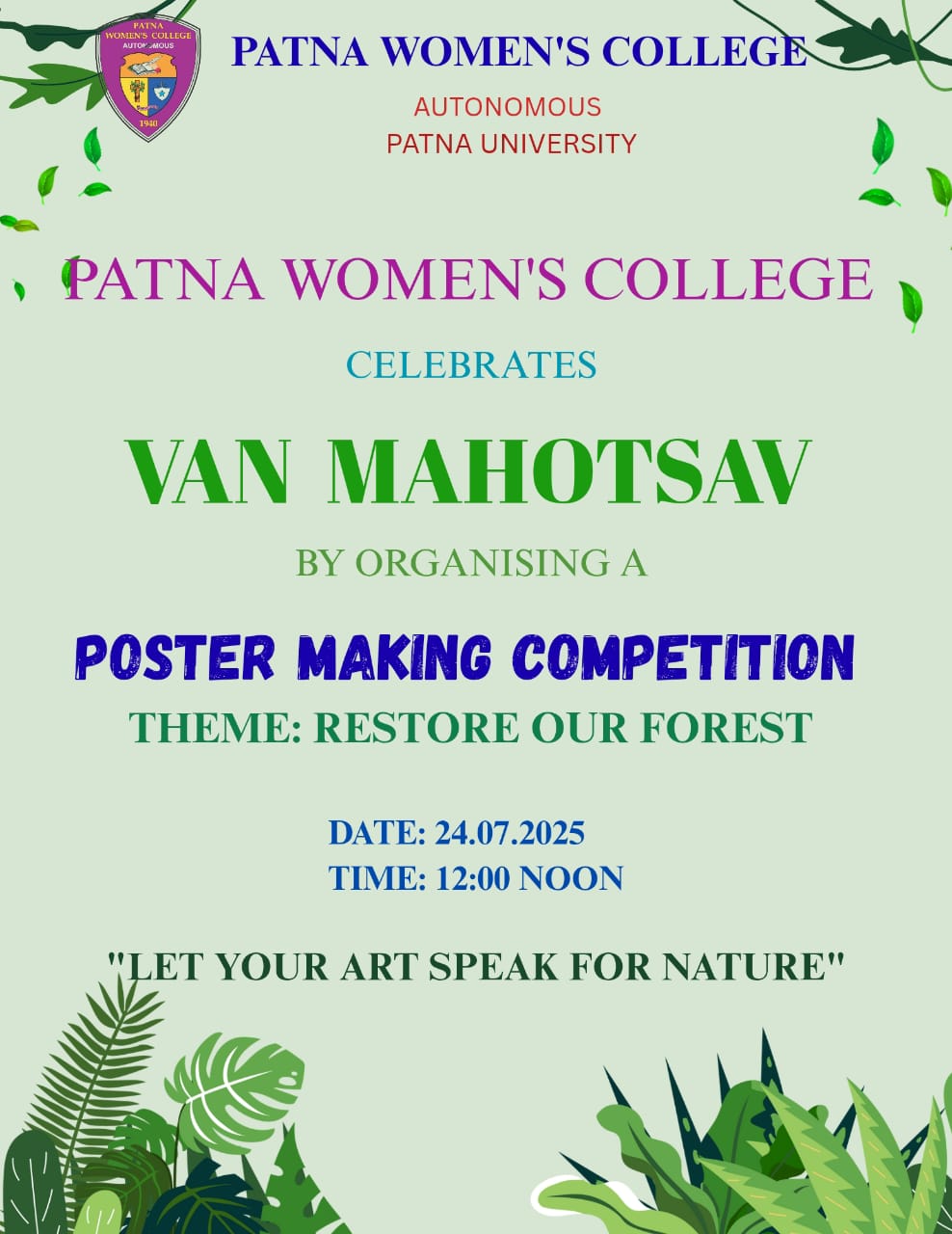On 24th July 2025, the Department of Zoology, Patna Women’s College (Autonomous), Patna University, enthusiastically participated in a Poster-Making Competition organized to mark Van Mahotsav – a festival dedicated to celebrating and promoting the vital importance of trees and forests.