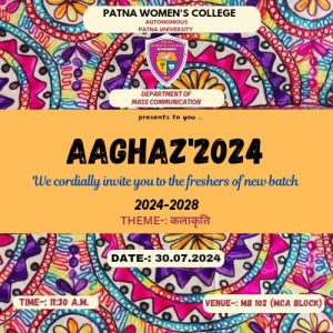 On July 30, 2024, the Department of Mass Communication, Patna Women’s College (Autonomous), Patna University, organized Fresher’s Day ‘Aaghaz 2024’ for UG Sem I (2024-2028 batch) and PG Diploma (2024-2025 Batch).
