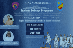 The Gandhi week Celebration concluded with an online student exchange programme between the students of Department of Political Science, Patna Women’s College, and Department of Political Science, Sophia Girl’s College, Ajmer. The students from different semesters of Political Science department from both the colleges participated and discussed their ideas over the topic ” The Relevance of Mahatma Gandhi in the 21st Century”. The event was held on Zoom platform at 5 pm and the main participants were Shambhavi from BA Sem. 5, Kyoto from BA Sem 3, and Shilpi from M. A. Sem. 1 from the department of Political Science, Patna women’s College. Avantika Nagar, Dimple Bhatia and Isha Khandelwal from MA Final year from the department of Political Science, Sophia Girl’s College, Ajmer participated. The session was moderated by Akanksha Rawet, Assistant Professor, Department of Political Science, Patna Women’s College.
