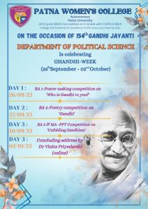 The students of MA 1 and MA 2 , BA 3 participated in the PPT competition. The judges were Mr. Ajay Kumar jha, Dr. Ragini Ranjan,Ms. Fiza Darakshan. The students of three batches reflected on the national movement. The theme was “unfolding Gandhism”.