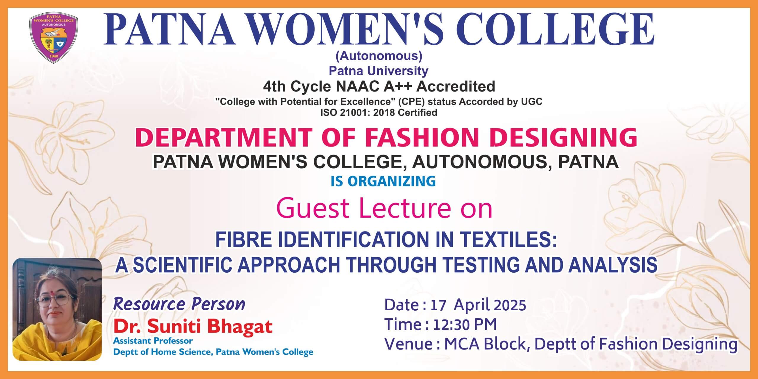 The Department of Fashion Designing, Patna Women’s College organised a guest lecture under students development programme on 17th April, 2025. The lecture was delivered by Dr. Suniti Bhagat, Assistant Professor, Department of Home Science, Patna Women’s College on the topic ‘Fibre Identification in Textile: A Scientific Approach Through Testing and Analysis’. Dr. Shemushi Madhu, HOD, Department of Fashion Designing welcome to the Guest Dr. Suniti Bhagat.