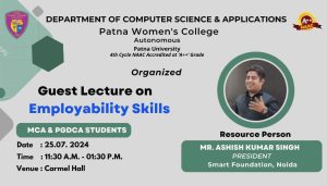 On 25.7.24, a guest lecture on “Employability Skills” was held at Patna Women’s College, aimed at providing valuable insights into the essential skills required for succeeding in today’s competitive job market. This lecture was especially relevant for students pursuing MCA and PGDCA programs. The event featured Mr. Ashish Kumar Singh, a distinguished expert in education and professional development, who shared his extensive knowledge and experience with the attendees.
