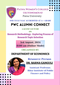 On 3rd August, 2024, Department of Economics, Patna Women’s College organised a guest lecture by Dr. Barna Ganguli, faculty, Bihar Institute of Public Finance and Policy (Research cell Finance Department) in online mode. She is an alumni of our college, passed out in the year 1995. The topic of the lecture was ‘Research Methodology: Exploring Process of Research Topic Selection’. It was organised for the students of semester Vth in order to improve their research ideas focusing on the selection of research topics as they are involved in Student Research Projects and Dissertation in their final year of graduation. She focused on framing objectives and hypothesis and importance of data availability for conducting research.