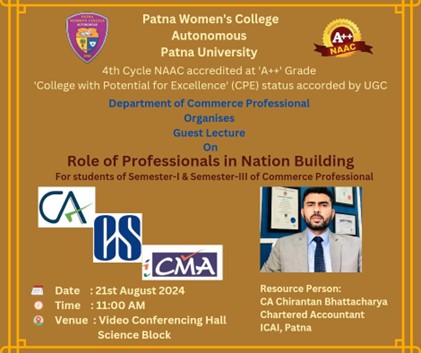 In this regard, a guest lecture was organized for the students of semester-I and semester-III of B.Com (Commerce Professional) on 21st August 2024 from 11.00 am to 12.00 pm in Video Conferencing Hall of Patna Women’s College. The resource person was CA Chirantan Bhattacharya, Institute of Chartered Accountants of India, Patna Branch.