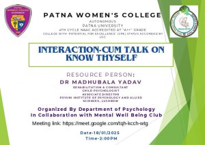 An online interaction-cum-talk on ‘Know Thyself’ was organised on 18.01.25 for the participants to understand themselves better. The resource person discussed the concept of personality and ways our attributes. She specifically discussed the Johari Window and its benefit in understanding ourselves and others.
