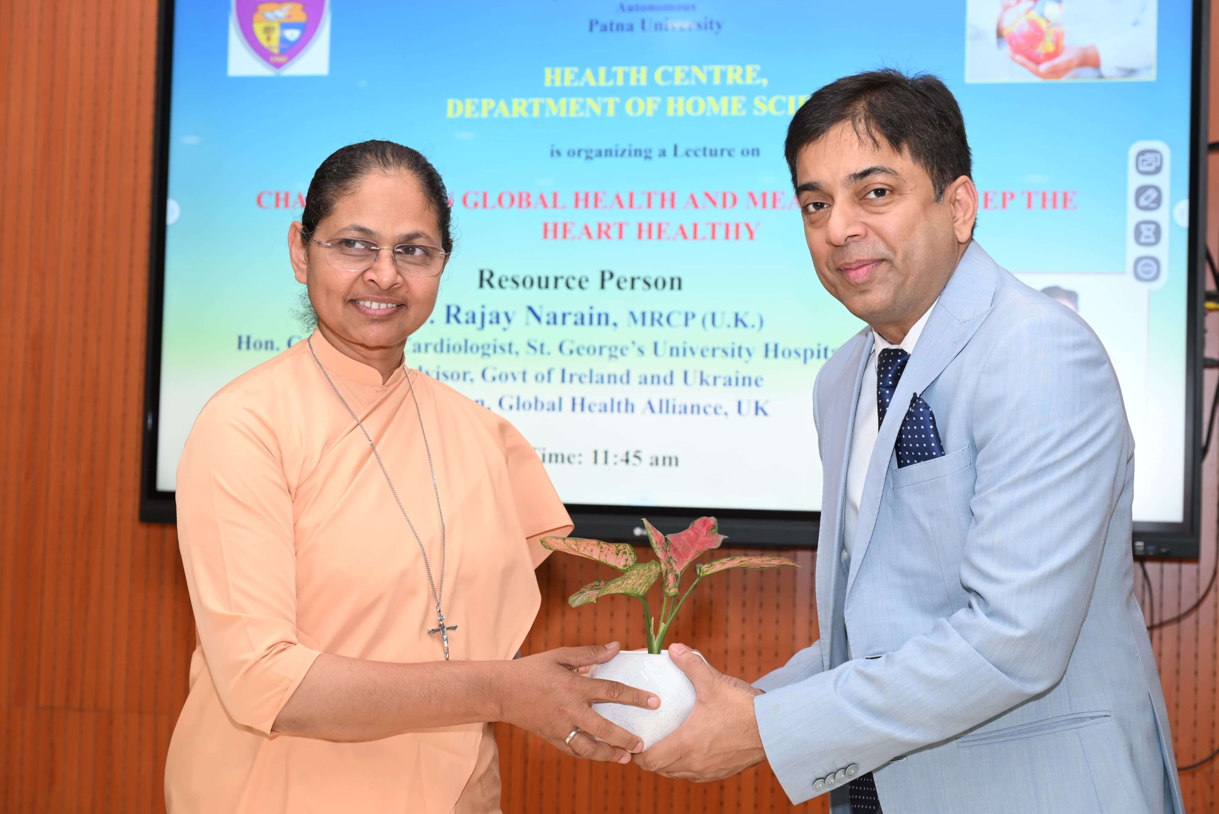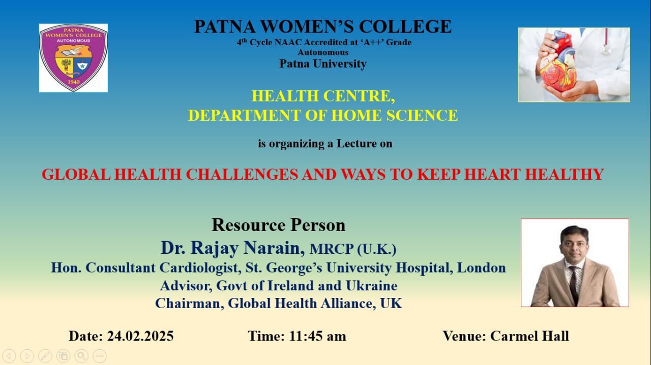 Health Centre, Department of Home Science organized a lecture on 24/02/2025 at 11:45 am in Carmel Hall. The topic of the lecture was “Global health challenges and ways to keep heart healthy”. The resource person was Dr. Rajay Narain, Hon. Consultant Cardiologist, St George’s University Hospital, London; Advisor, Govt. of Ireland and Ukraine; Chairman, Global Health Alliance, U.K. He discussed the prevalence of heart disease and diabetes globally and in India.Dr. Narayan outlined the global challenges like NCDs, pandemic, food and water insecurity, maternal and child health, inequalities and access to health care and mental health globally. He also talked about the preventive measures to reduce the increasing burden of global health challenges like strengthening healthcare system, addressing climate change, environmental health risk, combating infectious diseases and future pandemics, reducing the burden of NCDs, preventing antimicrobial resistance, ensuring equal healthcare access for all and strengthening health partnerships. The event concluded with an exciting question and answer session. The programme was attended by faculty and 1st year students of Home Science, Zoology, Botany, Biotechnology and Microbiology. A total of 135 participants attended the session.The programme was organized by Dr. Shazia Husain, Assistant Professor, Department of Home Science; In-charge Health Centre, Patna Women’s College. The event was conducted under the guidance of Dr. Sister M. Tanisha A.C., Head, Department of Home Science, Patna Women’s College. Vote of thanks was proposed by Dr. Nisha Kumari, Assistant Professor, Department of Home Science, Patna Women’s College.