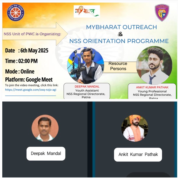 On 6th May 2025, The NSS Unit of Patna Women’s College (Autonomous), under Patna University, hosted an inspiring and insightful virtual session titled “My Bharat Outreach and NSS Orientation Programme. The two resource persons- Mr. Deepak Mandal, Youth Asst., NSS Regional Directorate, Patna & Mr. Ankit Kumar Pathak, Young Professional, NSS Regional Directorate, Patna was invited for this orientation Programme. This impactful event centered around youth empowerment, civil responsibility, and the transformative potential of national service in realizing the vision of a Viksit Bharat.