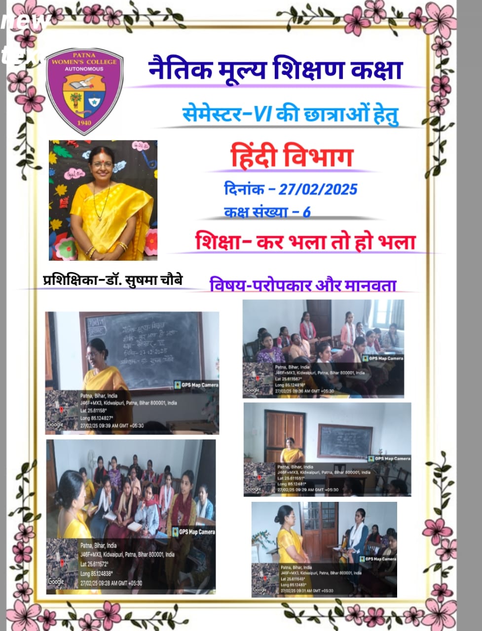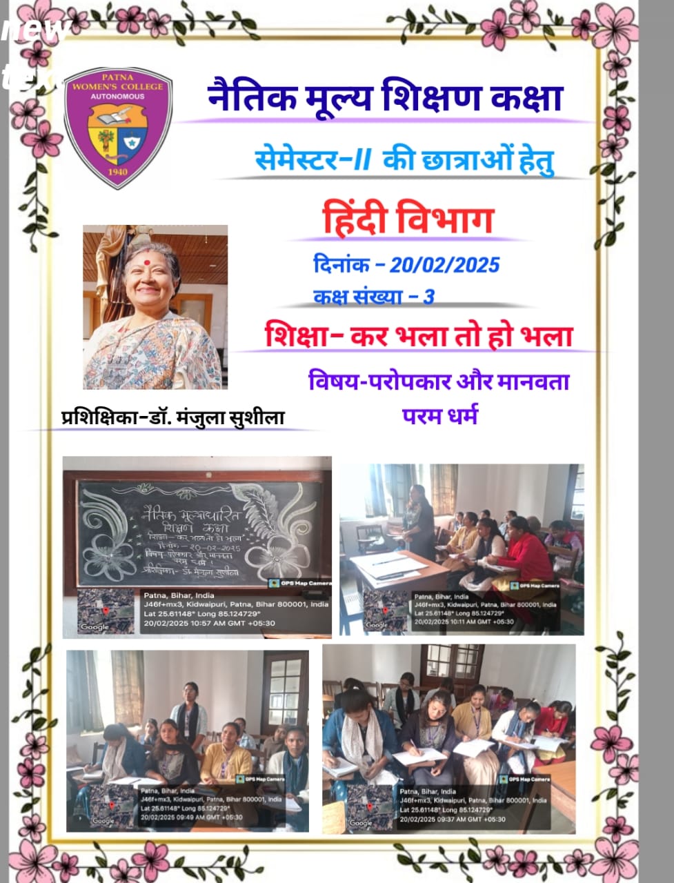 दिनांक 20/02/25 एवं 27/2/25को हिंदी विभाग की सेमेस्टर II एवं VI की छात्राओं हेतु , कक्ष संख्या 03 एवं 06 में ,प्रशिक्षिका डॉ मंजुला सुशीला एवं डॉ सुषमा चौबे द्वारा नैतिक मूल्याधारित शिक्षण कक्षा आयोजित की गई। कक्षा का विषय था– “परोपकार और मानवता परम धर्म”।एक ज्ञानवर्धक लघु फिल्म द्वारा छात्राओं को जीवन में परोपकार और इंसानियत का महत्व समझाया गया।इस विषय को समझते हुए छात्राओं ने भी अपने अपने विचार प्रकट किए।सामूहिक चर्चा के उपरांत सभी ने कक्षा के उद्देश्य पर प्रकाश डालते हुए सर्वसम्मति से इस बात को स्वीकारा, कि अच्छे आचरण और व्यवहार से मनुष्य को अच्छा फल अवश्य मिलता है ,अतः अपना मानव धर्म नहीं भूलना चाहिए। इस नैतिक मूल्याधारित कक्षा से सभी छात्राओं ने ” कर भला तो हो भला” की शिक्षा ग्रहण की।