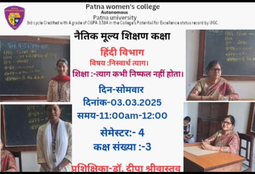 दिनांक 3 मार्च ,2025 को सेमेस्टर IV की छात्राओं की नैतिक मूल्य शिक्षण कक्षा हुई , जिसमें प्रशिक्षिका डॉ. दीपा श्रीवास्तव ने एक विडियो के माध्यम से”निस्वार्थ त्याग” विषय पर प्रेरणादायक व्याख्यान दिया। सभी छात्राओं ने अपने विचार व्यक्त करते हुए यह स्पष्ट किया कि सच्चा त्याग कभी निष्फल नहीं होता, बल्कि वह व्यक्ति के जीवन में गहरे संतोष और आत्मिक समृद्धि का संचार करता है। उन्होंने यह सीख ग्रहण की कि निस्वार्थ सेवा और त्याग समाज को सशक्त बनाने के साथ-साथ व्यक्ति को भी आंतरिक शांति प्रदान करता है। उदाहरणों और जीवन के वास्तविक प्रसंगों के माध्यम से उन्होंने समझा कि स्वार्थरहित समर्पण ही किसी व्यक्ति को महान बनाता है और समाज में सकारात्मक परिवर्तन लाने की शक्ति रखता है। यह सत्र केवल एक शिक्षाप्रद व्याख्यान नहीं था, बल्कि एक गहन अनुभूति थी, जिसने उपस्थित सभी विद्यार्थियों को नैतिक मूल्यों के प्रति नई दृष्टि और प्रेरणा प्रदान की।