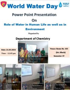 On the eve of the World Water Day ( 22.03.24), the Department of Chemistry , Patna Women’s College ,P.U , Organized a Power point presentation on 21.03.24. Ten students participated in the competition. Students Showed their creativity and awareness in PPT on the theme :Role of Water in Human Life as well as in Environment