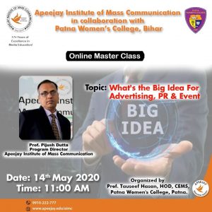 Apeejay School of Communication and development and Department of Communicative English and Media Studies on 14th May 2020, had conducted online guest lecture on ‘Big Idea of Advertising PR. & Event. The lecture session was really insightful and knowledge enriching for the students. A total number of 21 students of Semester IV attended the master class.