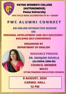 Department of English, Patna Women’s College organised an online lecture under “PWC Alumni Connect” programme on August 8, 2024 at 12 pm in Carmel Hall. This initiative aims to provide the students and teachers a platform to listen to and interact with the prominent alumni of the department.