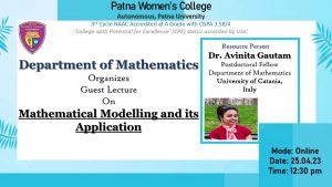 The Department of Mathematics , Patna Women’s College (Autonomous) organized an online guest lecture on 25th April, 2023 on the topic “Mathematical modelling and its applications” for the batch 2022-2025,Semester II. The resource person for the lecture was Dr. Avinita Gautam, Post-doctoral Fellow, University Of Catania, Italy.