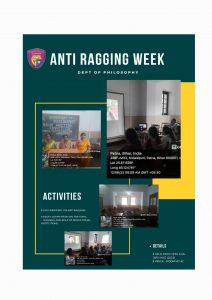 The Department of Philosophy observed Anti Ragging Week from 12th to 18th of August, 2023. On 12th of August a documentary movie showing the serious consequences of Ragging was shown to the students of the department. The students also filled and submitted an online affidavit form on Anti Ragging. An essay competition on the topic ” Ragging and the role of Educational Institutions ” was also organized in the department. All the activities aimed to create awareness among students regarding the practice and consequences of Ragging
