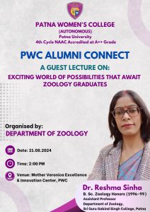 The Department of Zoology, Patna Women’s College, Autonomous, Patna University, organized a Guest Lecture by Dr. Reshma Sinha, Assistant Professor, Department of Zoology, Shri Guru Gobind Singh College, Patliputra University, Patna, and Alumna (Batch 1996-1999) of Department of Zoology, Patna Women’s College, on August 21, 2024, in MVEIC, Science Block, PWC.