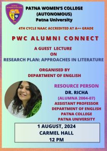 Department of English, Patna Women’s College organised a guest lecture on August 1, 2024 at 12 noon in Carmel Hall to mark the beginning of the “PWC Alumni Connect” programme. Introducing this unique initiative of Patna Women’s College, Dr Sahar Rahman, Head of the department, said that it aims to provide the students and teachers a platform to listen to and interact with the outstanding alumni from different fields. It would also give the alumni an opportunity to give back to their alma mater by sharing their expertise with the present students and forge a connect with the institution.