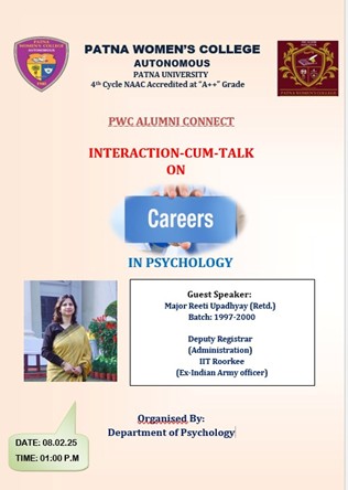 Department of Psychology, Patna Women’s College, Autonomous, organized an Interaction-cum-Talk on 08/02/2025. The Topic of today’s talk was “Careers in Psychology”. The program was started with prayer and God’s blessings. The Guest speaker was Major Reeti Upadhyay, Deputy Registrar IIT Roorkee. She is an Alumnus, Batch 1997-2000, Department of Psychology, Patna Women’s College.