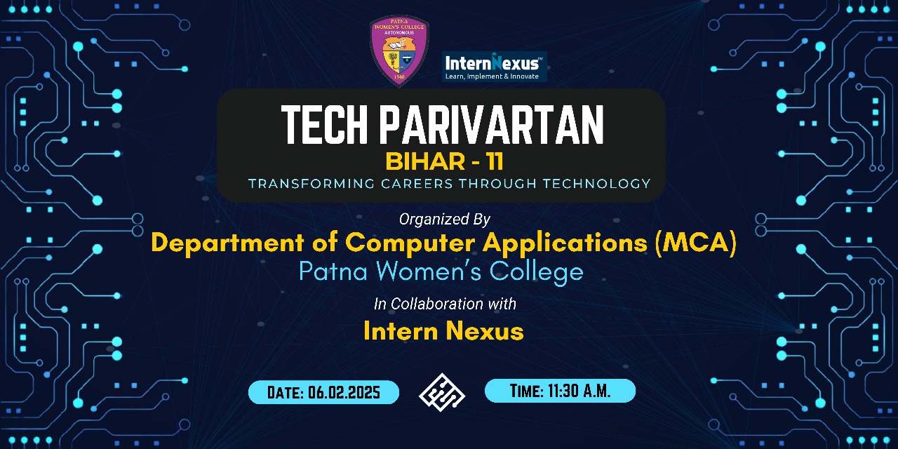 The Department of Computer Applications (MCA) at Patna Women’s College, in collaboration with Intern Nexus, successfully organized the seminar “Tech Parivartan (Bihar-11) – Transforming Careers Through Technology.” The event, held at 11:30 AM, aimed to provide students with insights into the vast opportunities in the IT sector, with a special emphasis on emerging technologies. Dr. Bhawna Sinha, Head of the MCA Department, started the programme with a welcome address who set the tone for an engaging and insightful session. The distinguished guest speakers included Mr. Piyush Pandey, CEO of Intern Nexus, Mr. Rakesh Kumar, Director of Intern Nexus, and Dr. Pooja, an industry expert. Mr. Piyush Pandey, the spokesperson for the event, introduced the “Tech Parivartan” initiative, highlighting its role in bridging the gap between students and industry through internships and placement opportunities, while encouraging students to explore advancements in AI, ML, and software development.