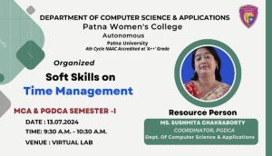 ‘Time Management for Students’ on 13.07.2024 from 9:30 a. m. to 10:30 a.m. for the students of MCA and PGDCA Semester-I. Ms. Sushmita Chakraborty, Coordinator, PGDCA & Assistant Professor threw light on how effective time management empowers students to achieve academic success, maintain a balanced lifestyle, personal life and prepare for a fulfilling future