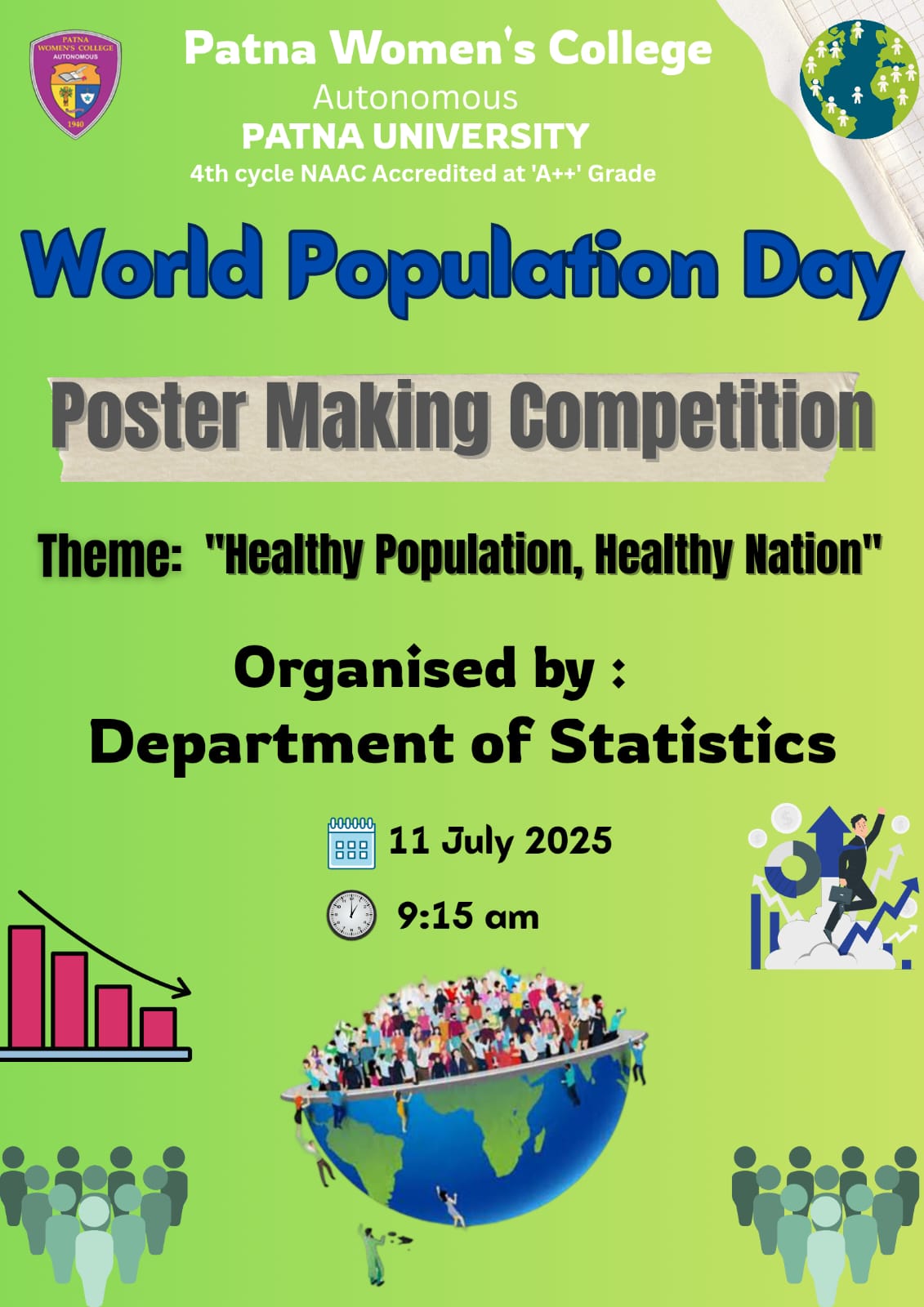 On July 11th 2025, on the occasion of World Population Day, the Department of Statistics at Patna Women’s College organized a vibrant and thought-provoking Poster-Making Competition on the theme: “Healthy Population Healthy Nation” to highlight issues related to population growth and sustainable development.