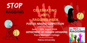 The poster making competition was organised by the department of Fashion Designing, Patna Women’s College on 16th August 2024 to create anti ragging awareness and promote ragging free environment in institutions.