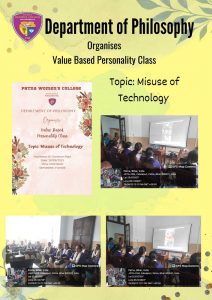 The Department of Philosophy organized a Value based personality class on 29.09.2023 for the students of Sem 3 and 5 . The students were shown a video on the topic ” Misuse of Technology ” and how it affects the peace and happiness of the family, followed by an interactive session. The facilitator of the class was Dr. Kumkum Rani.