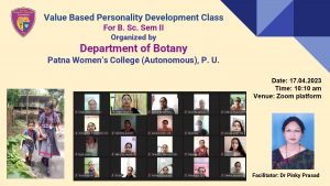 An online value based personality development class was conducted for Botany Sem II students on 17.04.2023 from 10:10 am onwards. A nice short video was shown to the students which was based on sweet relationship between a sister and her little brother which became affected when their father presented a mobile to his daughter and everything changed thereafter. But soon the girl understood the reason and returned back the mobile to her father. An interactive session with the students followed and the students shared their views. Dr Pinky Prasad, Head, Department of Botany fecilitated the class.
