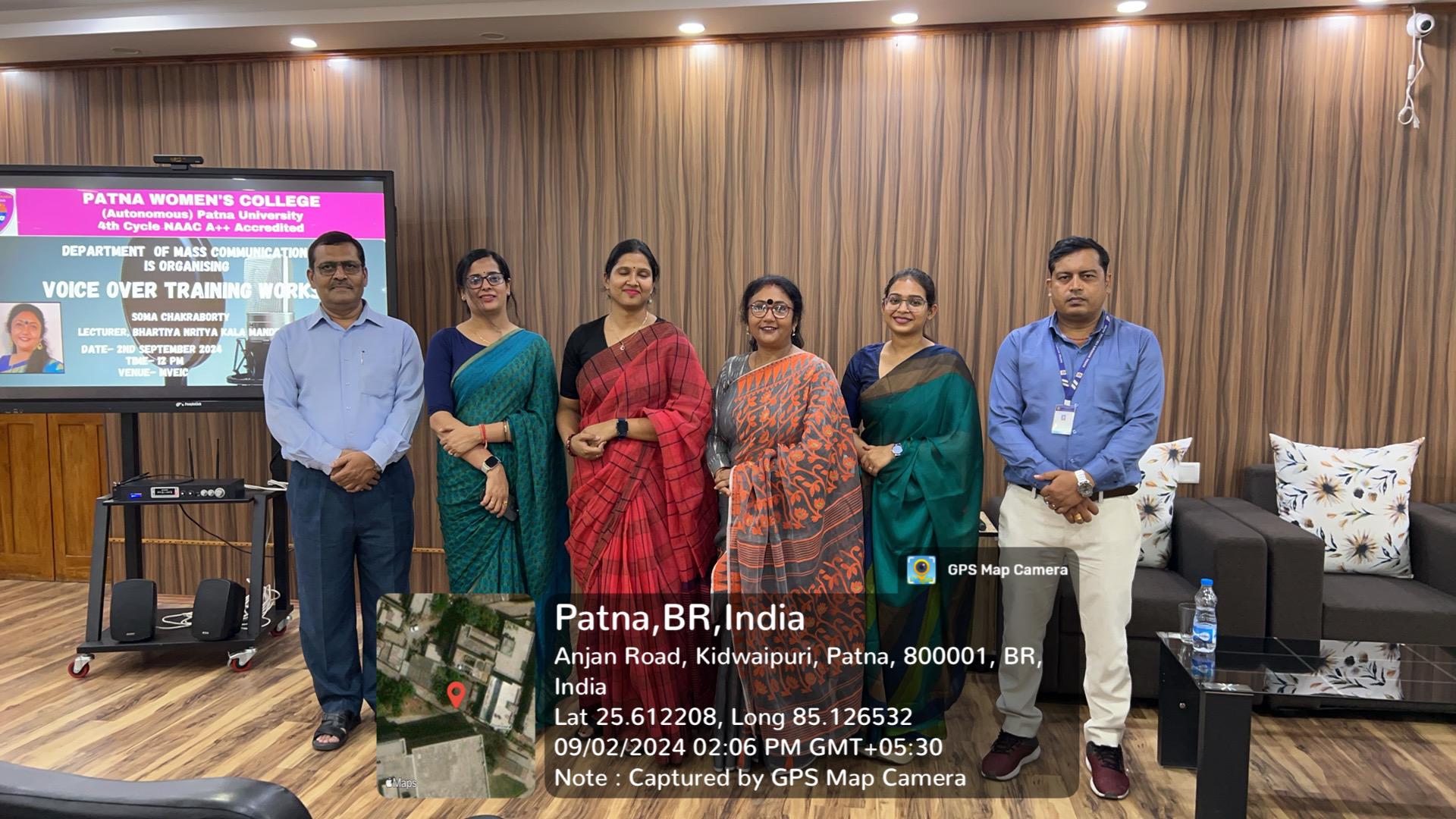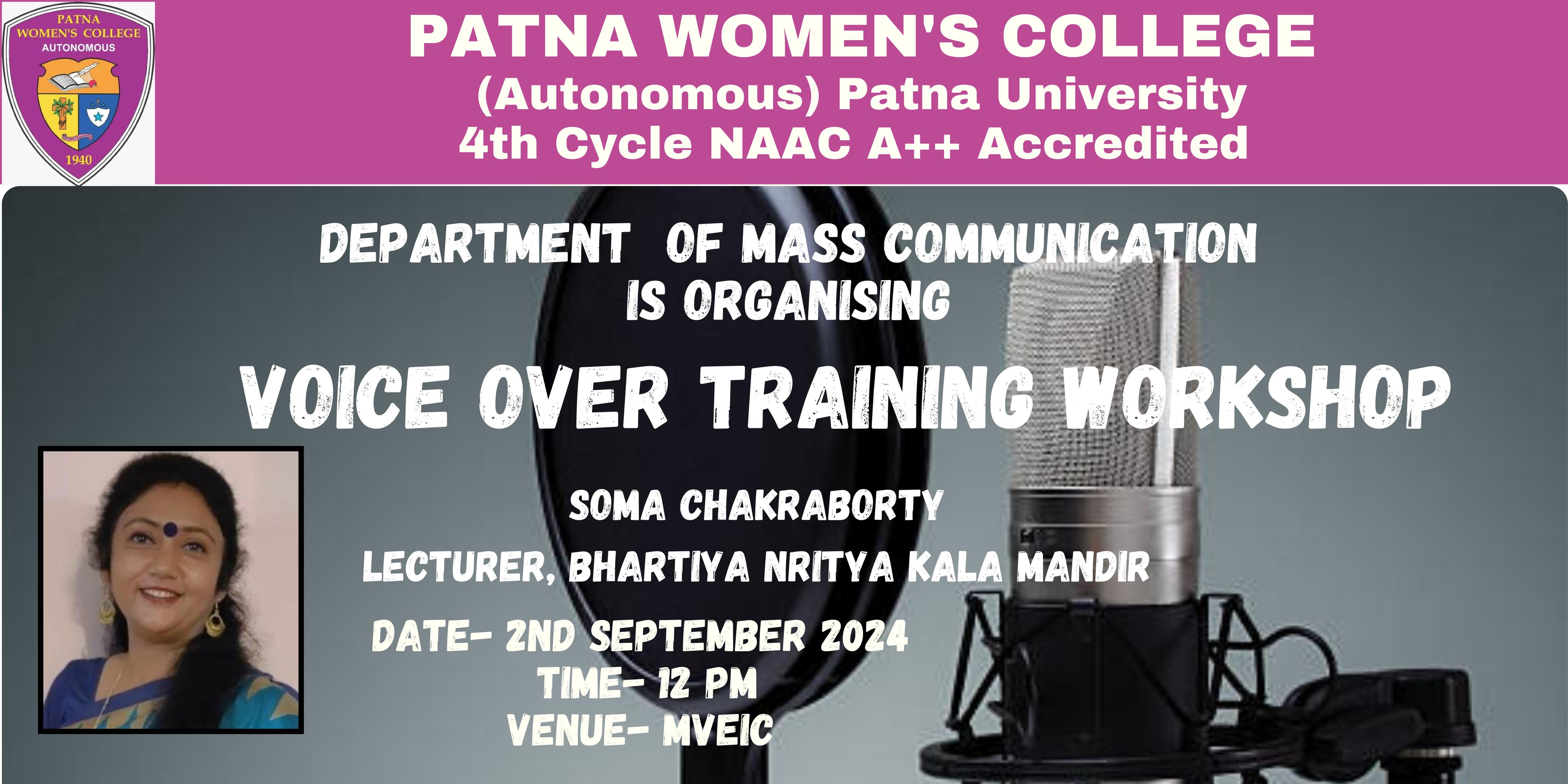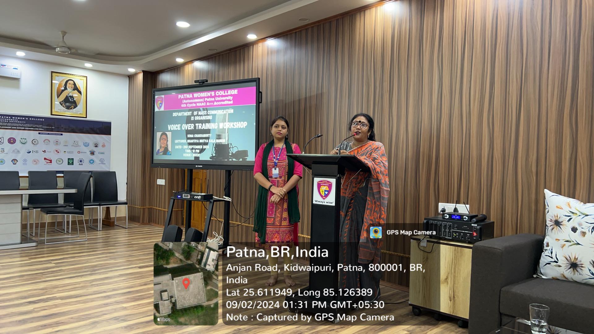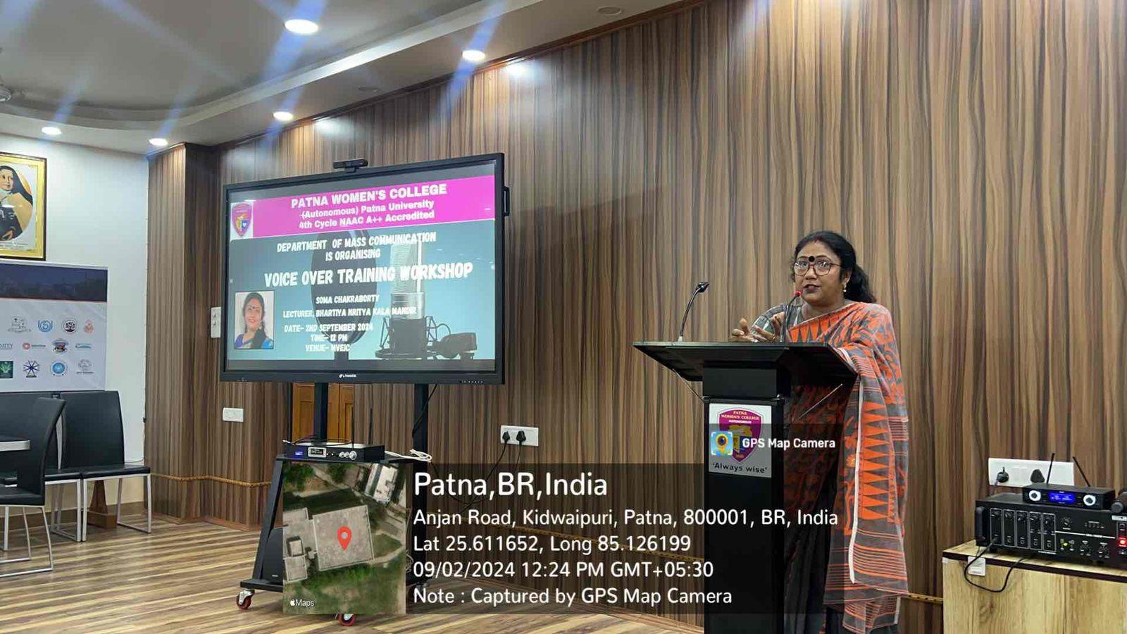 The Department of Mass Communication of Patna Women’s College (Autonomous) organized a “Voice-Over Training Workshop” on September 02. The workshop featured a guest lecture by Ms. Soma Chakraborty, a renowned classical dancer, and theatre artist from Bihar, and a current lecturer at the Bhartiya Nritya Kala Academy.