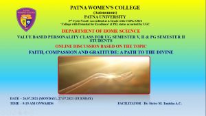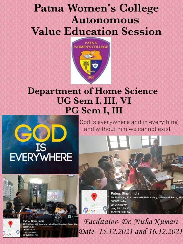 P. G Department of Home Science conducted a Value education class on 15th and 16 th december 2021 for UG sem I, III, VI and PG sem I, III students. The value education class included one video which was a short story with a message of presence of God everywhere. The class was conducted by Dr. Nisha Kumari that ‘God is always there to love, listen and comfort us. In all circumstances and stages of life, wherever we may be, whether good or bad, God is there for us’.