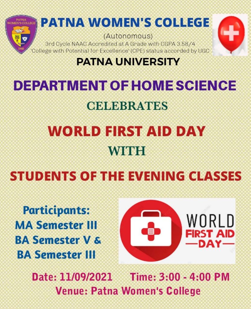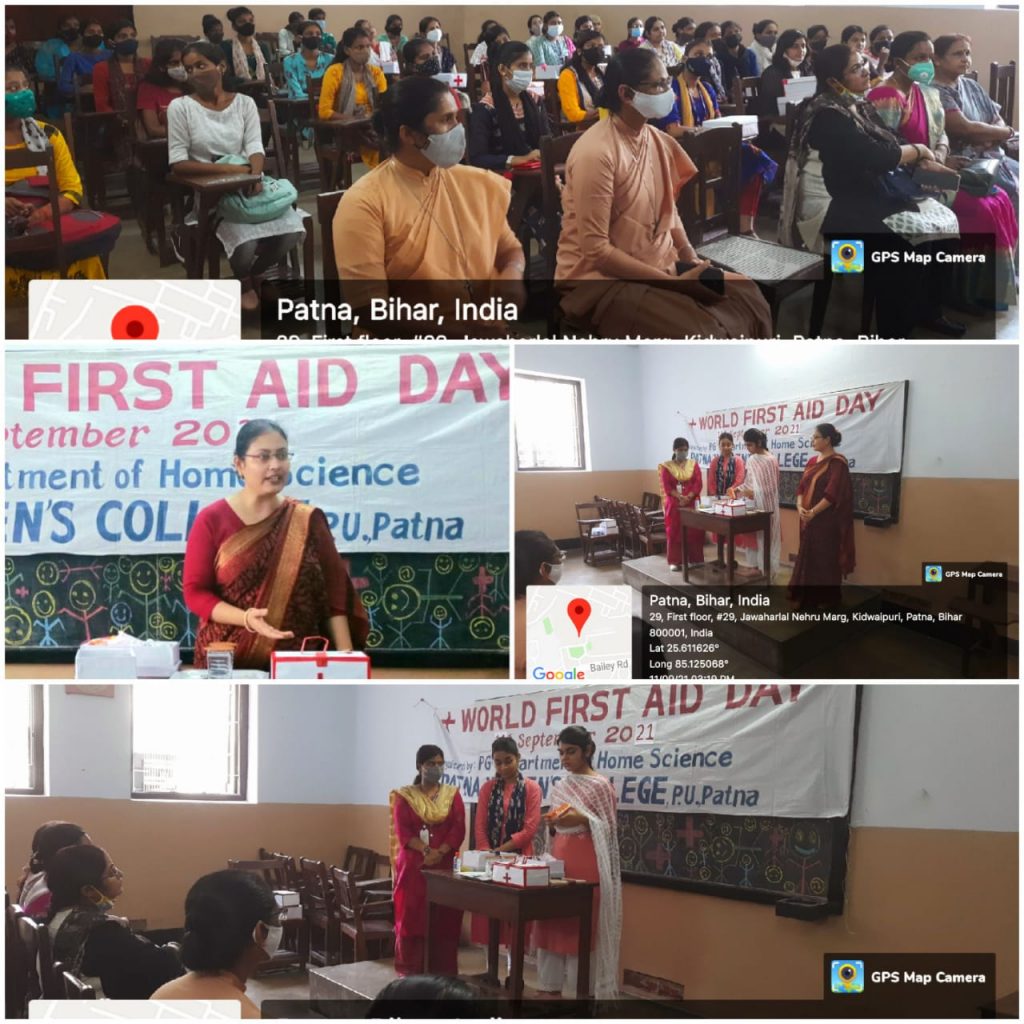 The Department of Home Science celebrated World First Aid Day on 10th September 2022. The students along with the teachers from the department, visited Scientific High School, Lalaji Tola, Patna, and conducted an awareness program regarding the importance of first aid.The awareness program was conducted among students to aid training and to increase awareness about the necessity of first aid in the event of any kind of injury or accident. The information was given to the school students by explanations and demonstrations wherein the students were taught to assist in a first aid emergency, along with beneficial awareness of various first aid techniques such as how to provide first aid for burns, cuts, eye injury, broken bones, and an overview of how to perform CPR. The school students took keen interest in this awareness program and found it quite informative.The program was organised under the supervison of Dr. Sister M. Tanisha A.C., Head, Department of Home Science. The programme was coordinated by Dr. Shazia Husain, Assistant Professor, Department of Home Science.