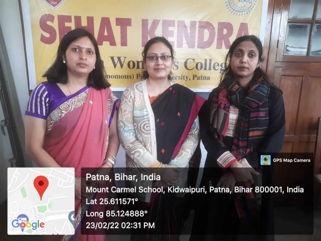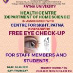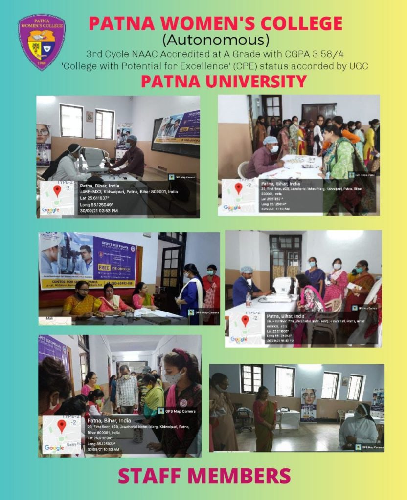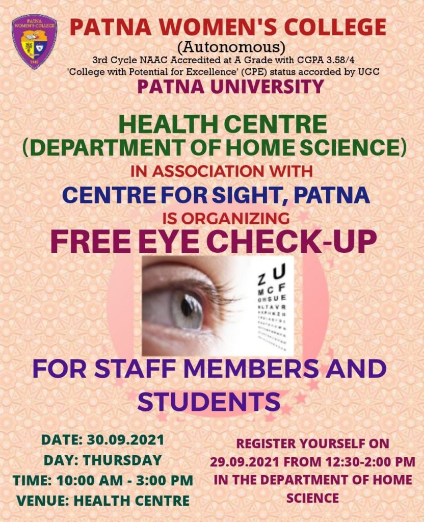 A free eye check-up was organized by the Health Center, Department of Home Science, Patna Women’s College in collaboration with “Center for Sight, Kankarbagh, Patna on 30th September 2021 from 10am-3pm. The check-up was done by Dr. Akankshi Anand and her team members. 160 students, 30 teachers and 34 non-teaching staff members turned up for the check up. Eye problems like refractive index, glaucoma, near vision syndrome and cataract were diagnosed by the doctors.