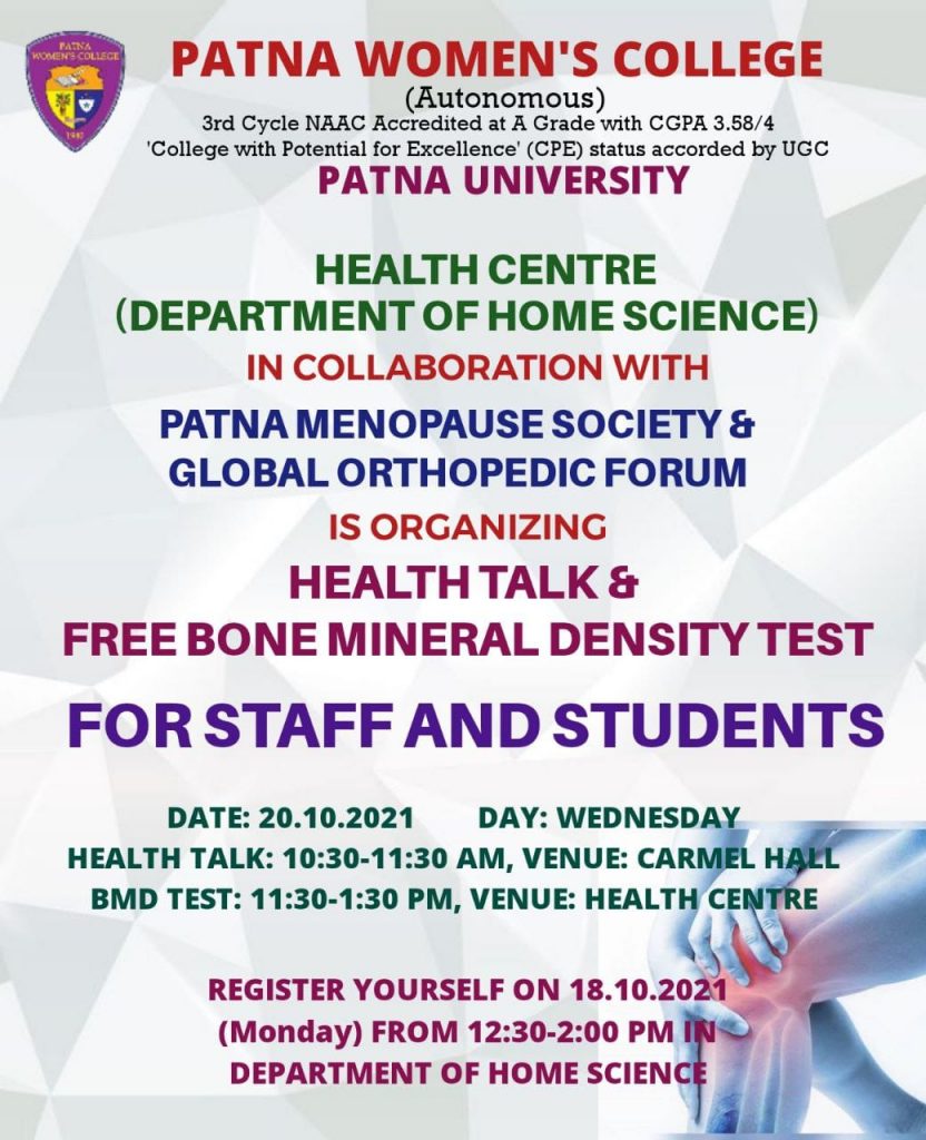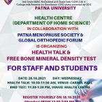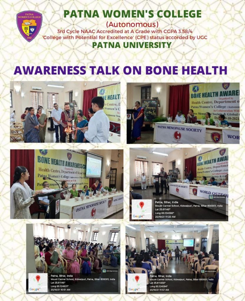 Health Centre, Department of Home Science organised an awareness programme on bone health in collaboration with Patna Menopause Society and Global Orthopaedic Forum on 20th October 2021. A panel of gynecologists Dr. Nibha Mohan, Dr. Kusum Gopal Kapur & Dr. Usha Didwania spoke on menopause, symptoms, problems related to bone, their prevention and remedies. A renowned group of orthopaedicians Dr. Amulya Kumar Singh, Dr. Ramit Gunjan and Dr. Arnab Sinha discussed on musculoskeletal problems. The programme was very informative, interesting and interactive.
