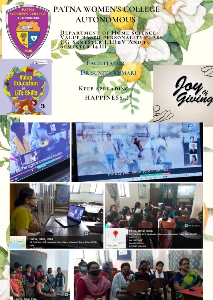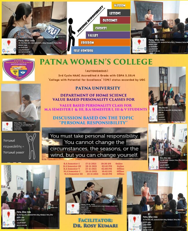 Value based personality class was organized by the Department of Home Science on the topic ” Personal Responsibility”. The classes were organised virtually for UG semester I, III and physically for PG semester I, III and UG semester- V, on 17th, 20th, 24th 25th and 26th respectively. The facilitator of the class was Dr. Rosy Kumari.