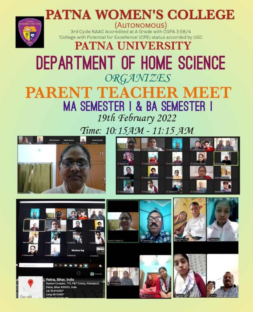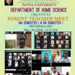 Parent Teacher Meeting for P.G. and U.G. Ist Semester students was organised on 19th January 2022 by the Department of Home Science virtually.The teachers of the department Dr. Sister M. Tanisha A.C. (Head of the Department), Dr. Shazia Husain, Dr. Suniti Bhagat, Dr. Rosy Kumari, Dr. Sunita Kumari and Dr. Nisha Kumari were virtually present for the meeting.