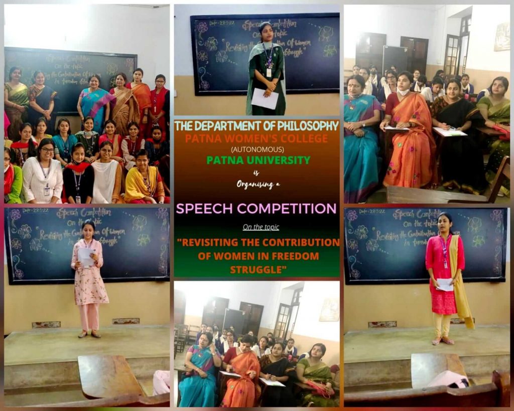 A speech Competition on the topic “Revisiting the contribution of women in freedom struggle” was conducted in the Department of Philosophy to celebrate Azaadi ka Amrit Mahotsav on 28.03.2022 in which students of Sem II, IV & VI participated. The students recalled the contributions of women like Bhima bai holkar, Rani Laxmibai, Sarojini Naidu, Kasturba Gandhi, Aruna Asaf Ali, Begum Safia Abdul wajid etc..in freedom struggle. The programme was conducted under the Guidance of Dr. Ameeta Jaiswal, Prof. & Head, Department of Philosophy. Ms. Tanya Banerjee & Dr. Ameeta Jaiswal were the judges Teachers of the Department Dr. Kumkum Rani, Dr. Keerti Choudhary and Ms. Shyam Priya were also present.