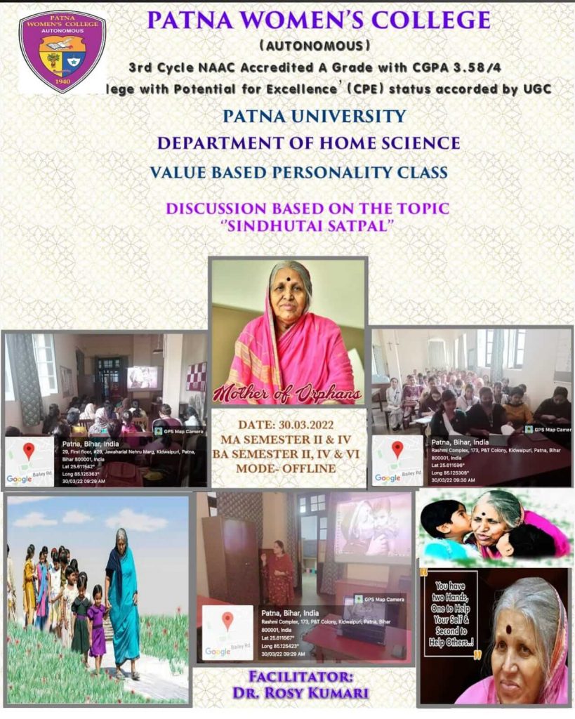 “Sindhutai Sapkal” was the theme of the personality class. On March 30th, classes for UG (semester II, IV, and VI) and PG (semester II & IV) students were held offline. Dr. Rosy Kumari was the program’s facilitator. The personality class was based on the life path of Sindhutai Sapkal. She is best known in India as the “Mother of Orphans,” an Indian social worker and activist who is most renowned for her work with orphaned children. That’s why she’s known as “Mai” (Mother). The video showed Sindhutai Saplak’s dedication towards orphan children throughout her life. She adopted many orphan and destitute children and because of her efforts they got a better life and good future. She also conducted a lot of work with the underprivileged groups. There is no disability bigger than poverty and deprivation. Sindhutai overcame this challenge and showed the world that even without any personal resources she could lift hundreds of young orphaned boys and girls out of poverty, homelessness and brought the light of education into their lives. Sindhutai lived to shape the lives of helpless young children.