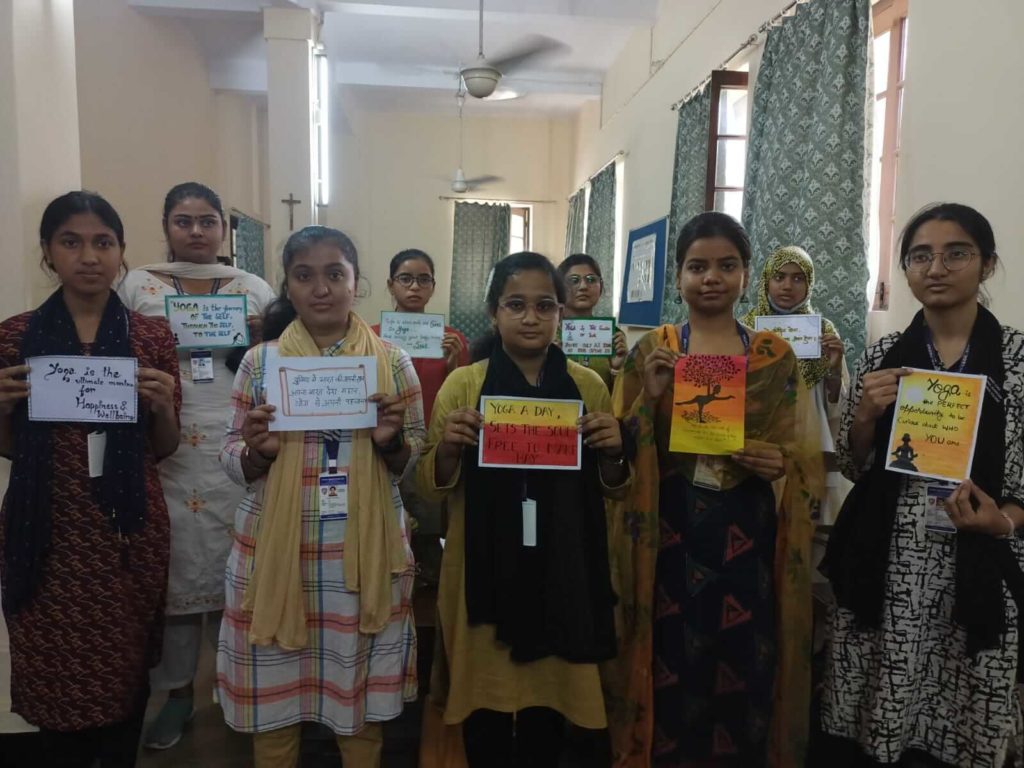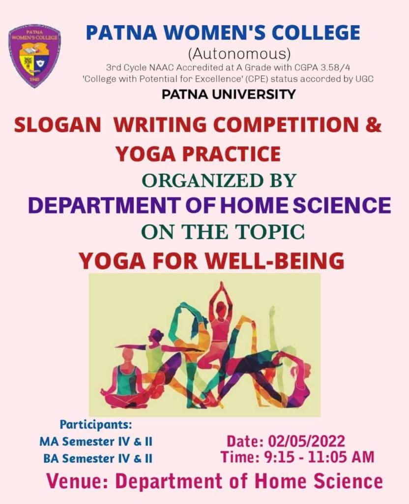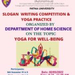 International Yoga Day was celebrated by the Department of Home Science on 2nd May 2022. The theme of the program was “Yoga for well-being”. Slogan writing competition and practical yoga session was organised for the students of PG Semester IV & II and UG Semester IV & II. The program was conducted from 9:15 to 11:05 am in the department.