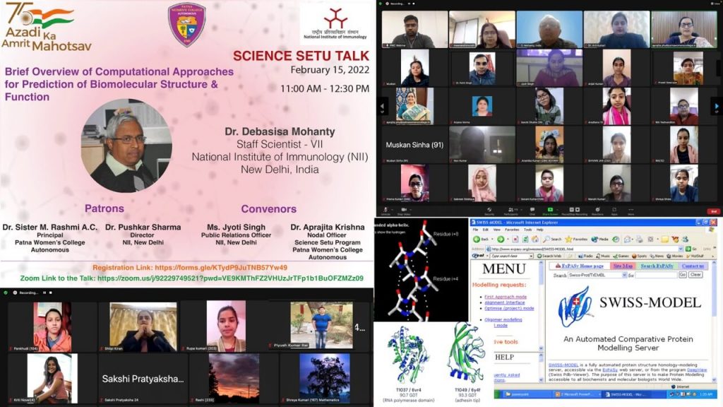A Science Setu Talk was organised by Patna Women’s College, Autonomous in collaboration with National Institute of Immunology, New Delhi, on February 15, 2022. The talk was given by Dr. Debasisa Mohanty, Scientist VII, National Institute of Immunology. The topic of the talk was “ Brief Overview of Computational Approaches for Prediction of Biomolecular Structure & Functions”. The talk was organised through online platform, Zoom. A total of ca. 210 participants joined for the talk. The talk provided a brief glimpse on computational techniques in modelling of proteins, their three-dimensional structures based on their sequencing and comparison on conventional ab initio and comparative methods based on applications of evolving artificial intelligence into the calculations/simulations.
