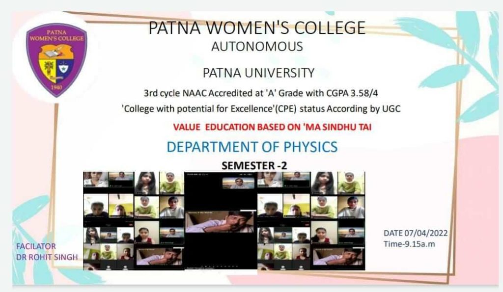 The Department of Physics, Patna Women’s College, organised a programme to bid adieu to the PG students of session 2020-2022 on 28.05.2022. This programme was organised by the PG students of the second semester of the department. The students presented a short cultural programme for their seniors. It consisted of a welcome song, welcome address by the Head of the Department, speech and recitation of a self composed poem and a group song. The outgoing students shared their feelings and experiences of the past two years in the college and department. The faculties of the department also shared their experiences and views about the outgoing students and wished them good luck for their future endeavours. All the Faculty and staff members of the department of Physics were present on the occasion.