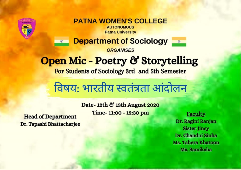 Department Sociology organised an OPEN MIC – Poetry and Story telling with students of 3rd and 5th Semester. Topic- Bhartiya Swatantrata Andolan. Time: 11:00 am to 12:30 pm
