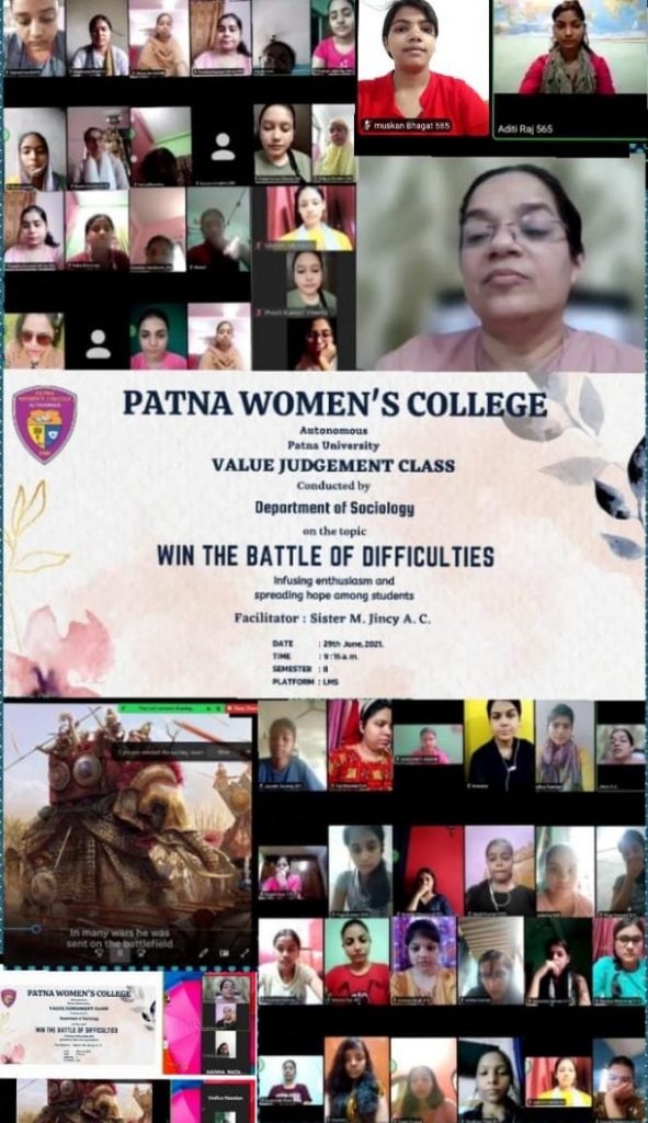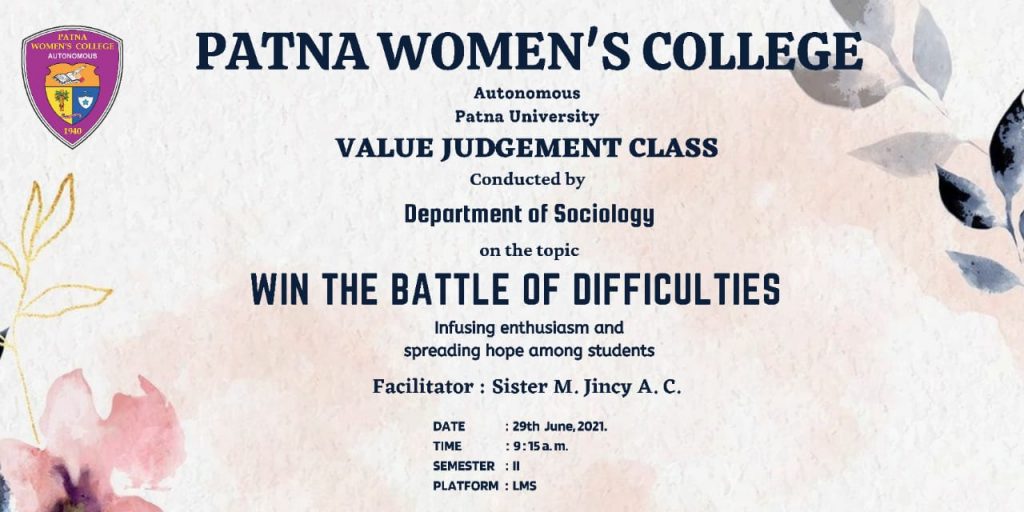 Department of Sociology conducted a value judgement class on the topic Win the battles of Difficulties, infusing enthusiasm and spreading hope among students. A video was played and class was conducted by Sister M. Jincy A.C. with the students of sociology semester II on 29th June 2021 at 9:15 am through lms portal.