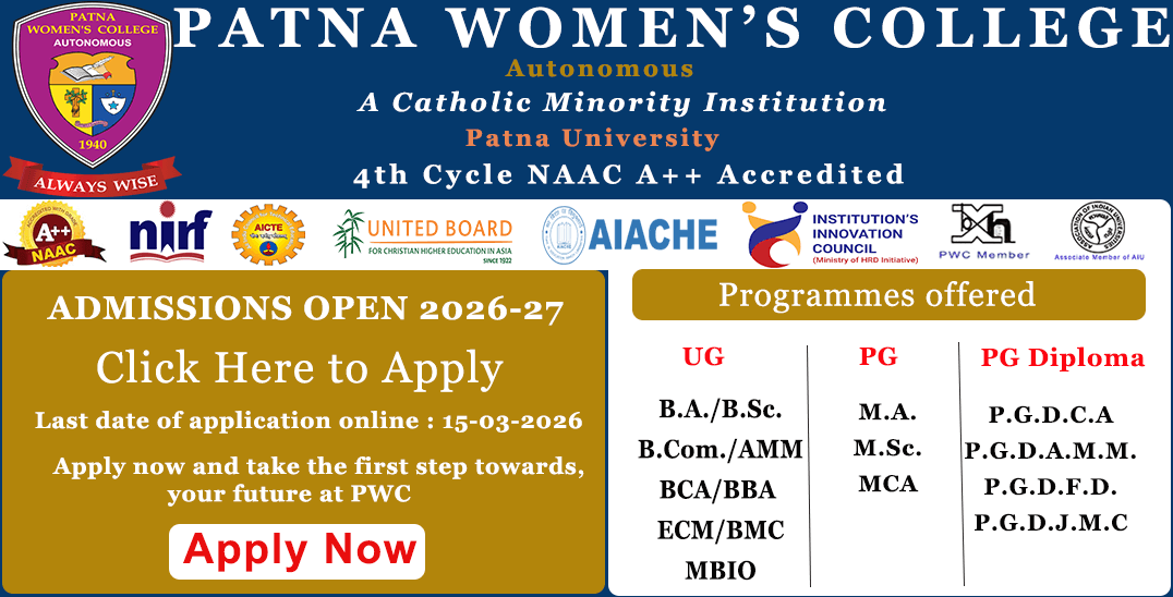 Admission 2026-27 Annual Fee Details New   Vigyan Utsav 2026 Register Here New   Admission Form 2026 Link New   Admission 2026 Notice New   Mid Semester Exam time table 2026 Notice New   PWC 4th Annual Convocation Notice New   Contribute to MELAK 2025: Literary Corner & Memory Walk New  PM Vidyalaxmi (Education Loan) Scheme Link New  SWAYAM-NPTEL ENROLLMENT July -Dec 2025 New  NAAC REACCREDITED WITH A++ CGPA OF 3.51 New    Patna Women’s College gets remarkable ranking in MDRA – India Today Best Colleges 2025  Corona Crusaders College Magazine   Alumni Association Life Membership/Contribution Form Link   Patna Women's College is ranked at a rank band of 101 - 150 in the NIRF 2025 Ranking under College category