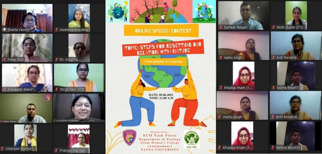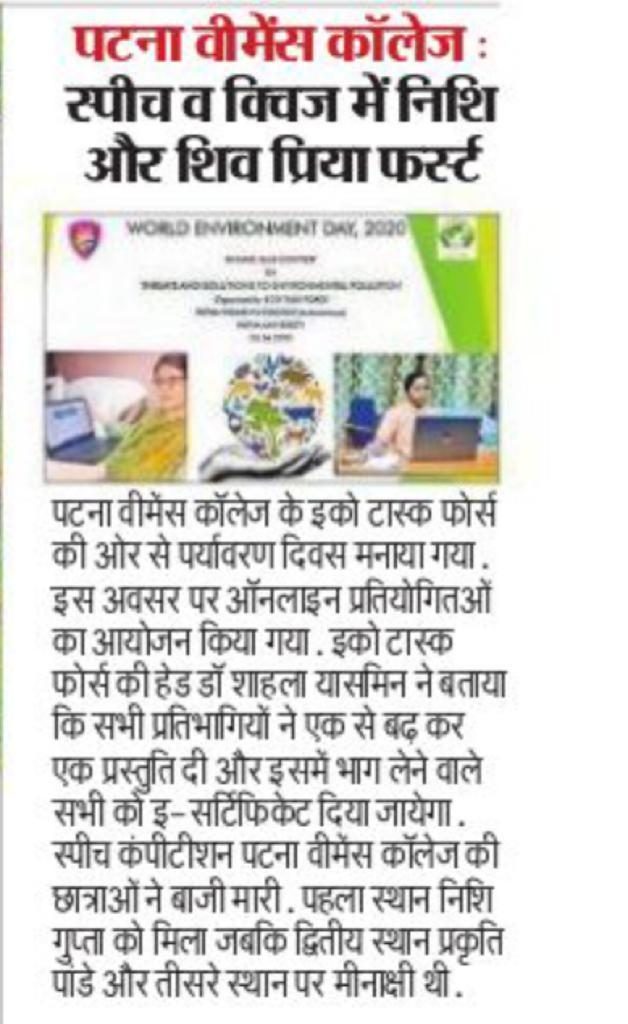 On the occasion of World Environment Day, (05.06.20) the ECO Task Force, Patna Women’s College , Autonomous, Patna University , organised a Speech Contest on the Theme : ‘Positive and Negative Impacts of Lockdown on Environment,The Prize Winners are:
