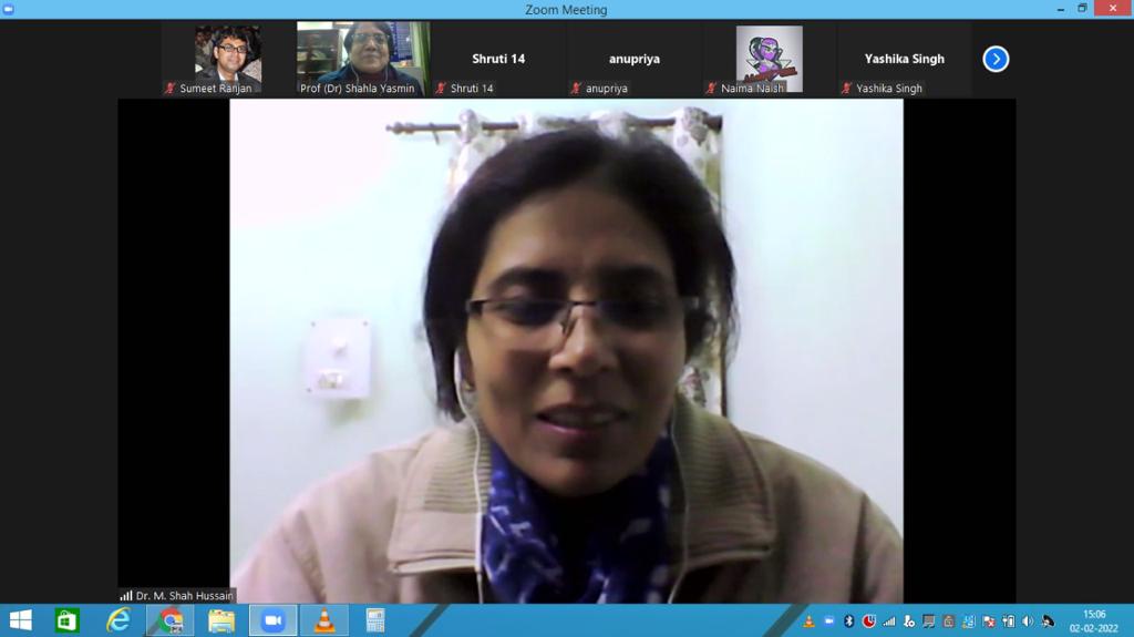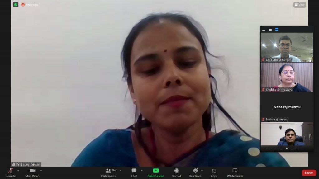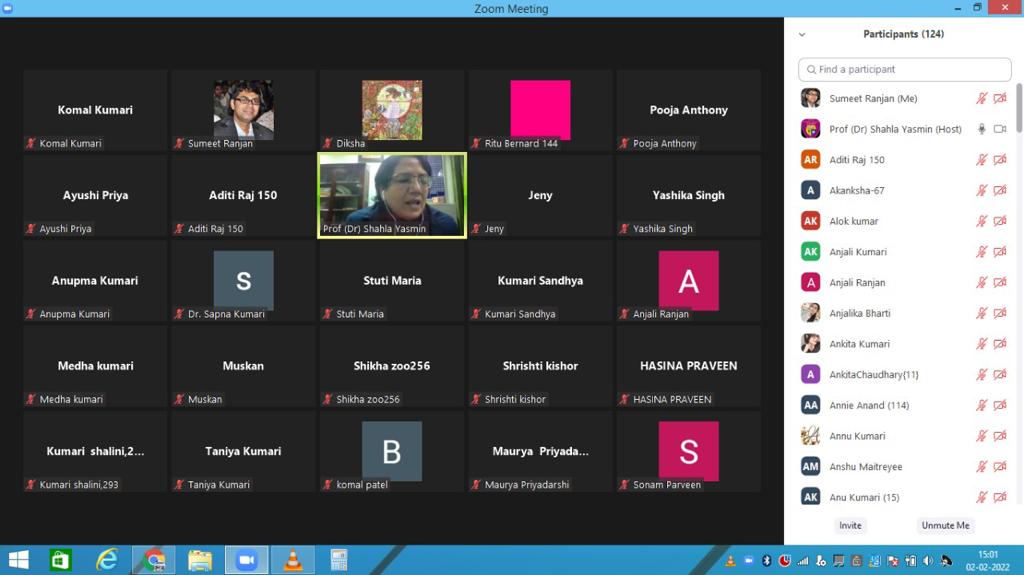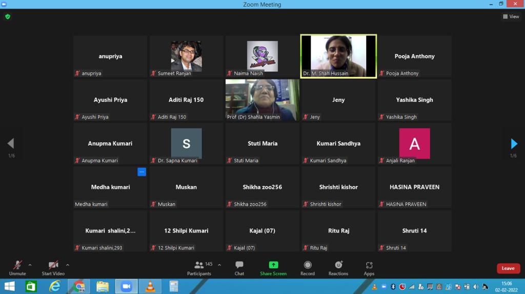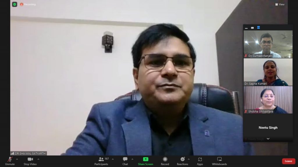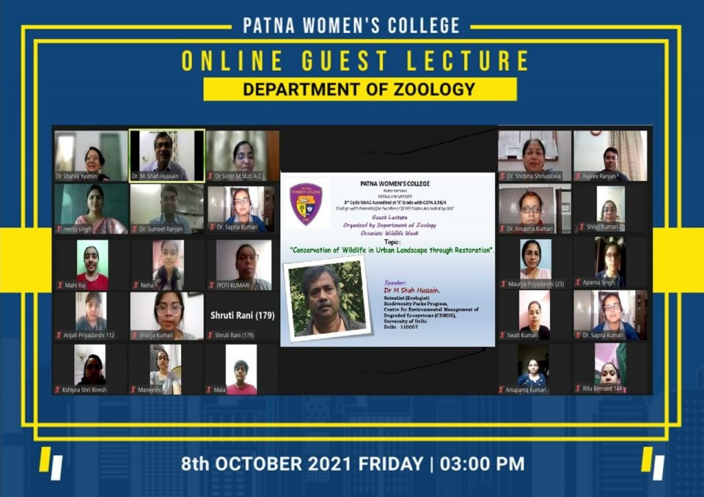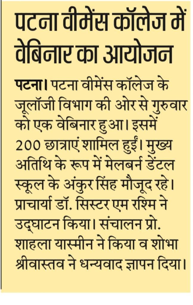 Dr. Sister Rashmi AC, Principal, Patna Women’s College,Autonomous addressed the participants of the Webinar. Prof.(Dr.) Shahla Yasmin, Head, Department of Zoology and Dean, Science Faculty, PWC introduced the Guest Speaker and the topic of the Webinar. Vote of thanks was proposed by Dr. Shobha Shrivastava, Associate Professor, Department of Zoology.